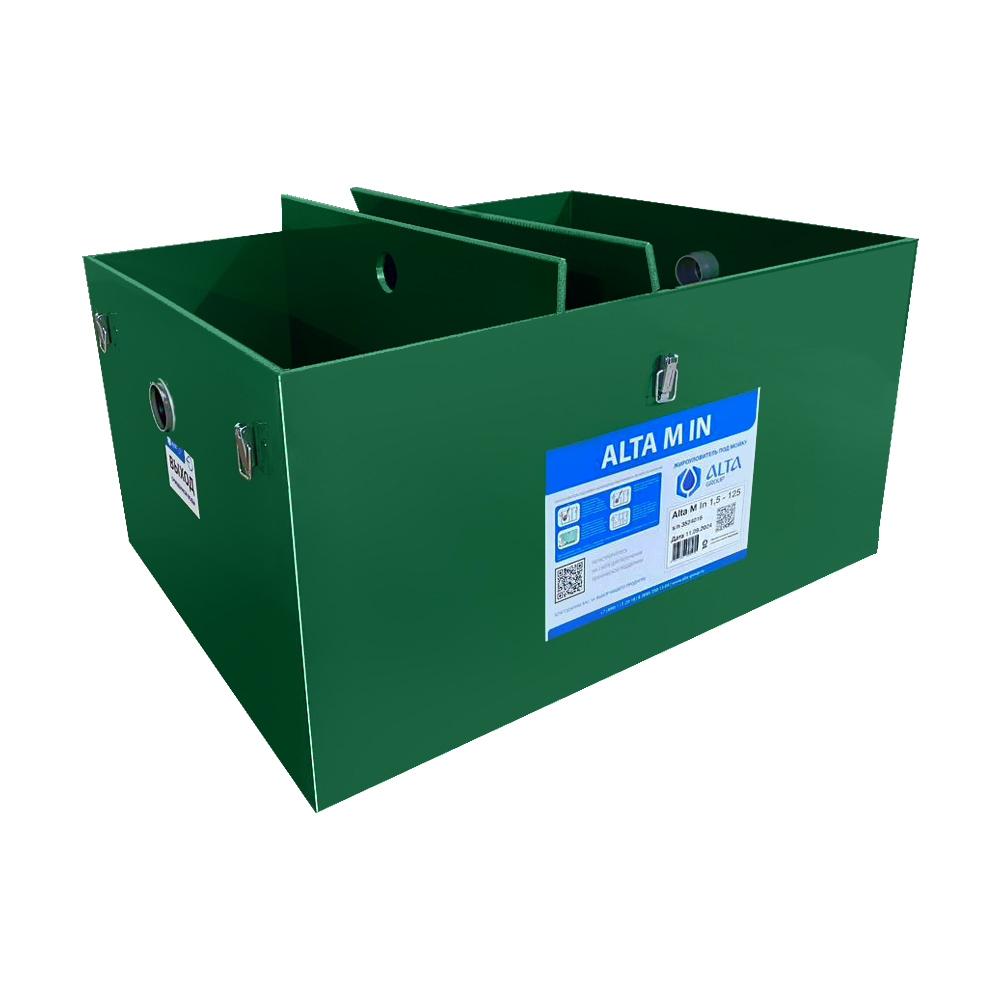 Жироуловитель под мойку Alta M-In 1.5-125 изготовлен из пищевого пластика. В соответствии с санитарно-эпидемиологическим заключением №77.01.03.485.П.014961.03.10 от 16.03.2010г., жироуловитель Alta M-In 1.5-125 разрешено устанавливать непосредственно в помещении кухни предприятий общественного питания.